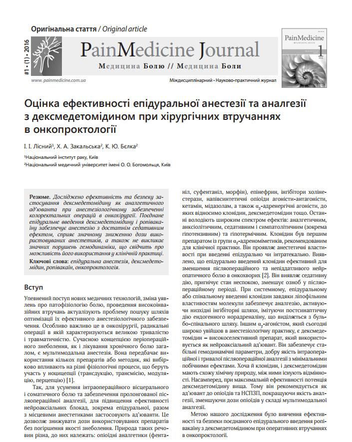 Lіsniy II, Zakalska KA, Bielka KY. Assessment of effectiveness of epidural anesthesia and analgesia with dexmedetomidine in colorectal surgery in patients with cancer. PMJUA [Internet]. 2016 Mar. 1 [cited 2026 Mar. 21];1(1). Available from: https://painmedicine.org.ua/index.php/pnmdcn/article/view/7