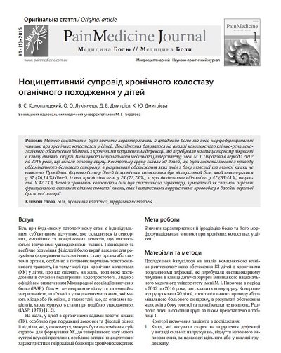 The aim of this research was to study the characteristics and pain iradiation, and its morphological and functional factors of chronic constipation in children. The study was based on analysis of integrated clinical and radiological examination of 88 children with chronic disorders of defecation hospitalized to the Clinic of Pediatric Surgery of National Pirogov Memorial Medical University (Vinnytsia) in the period from 2012 to 2016, that made the main group. Control group included 30 children hospitalized because of abdominal pain, in whom no changes were found were found in large and small intestine. The leading form of pain in children with chronic constipation was visceral pain observed in 67 (76.14 %) children, including dolihosihma – in 24 (72.73 %), and dolihocolon – in 47 (85.45 %) patients respectively. In 47.73 % of children with chronic colostasis pain was of spastic character caused by a spasm of certain functional active sites of large intestine as well as by severe disorders of blood circulation in the pool of superior mesenteric artery.